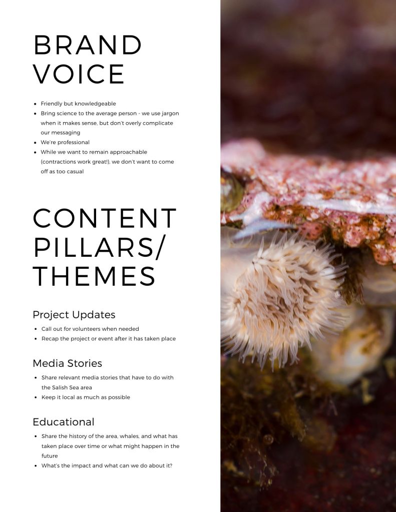 Saturna Island Marine Research and Education Society hired me to create the branding and tone of voice for their social media channels and then train their team on each channel’s best practices. Over the course of six months, I created some of the training and brand book elements you see below and connected with their team over Zoom for training sessions.